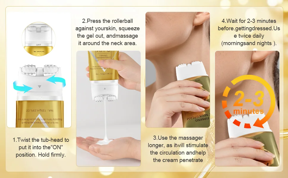 2.Press the rollerball against your skin, squeeze the gel out, andmassageit around the neck area.